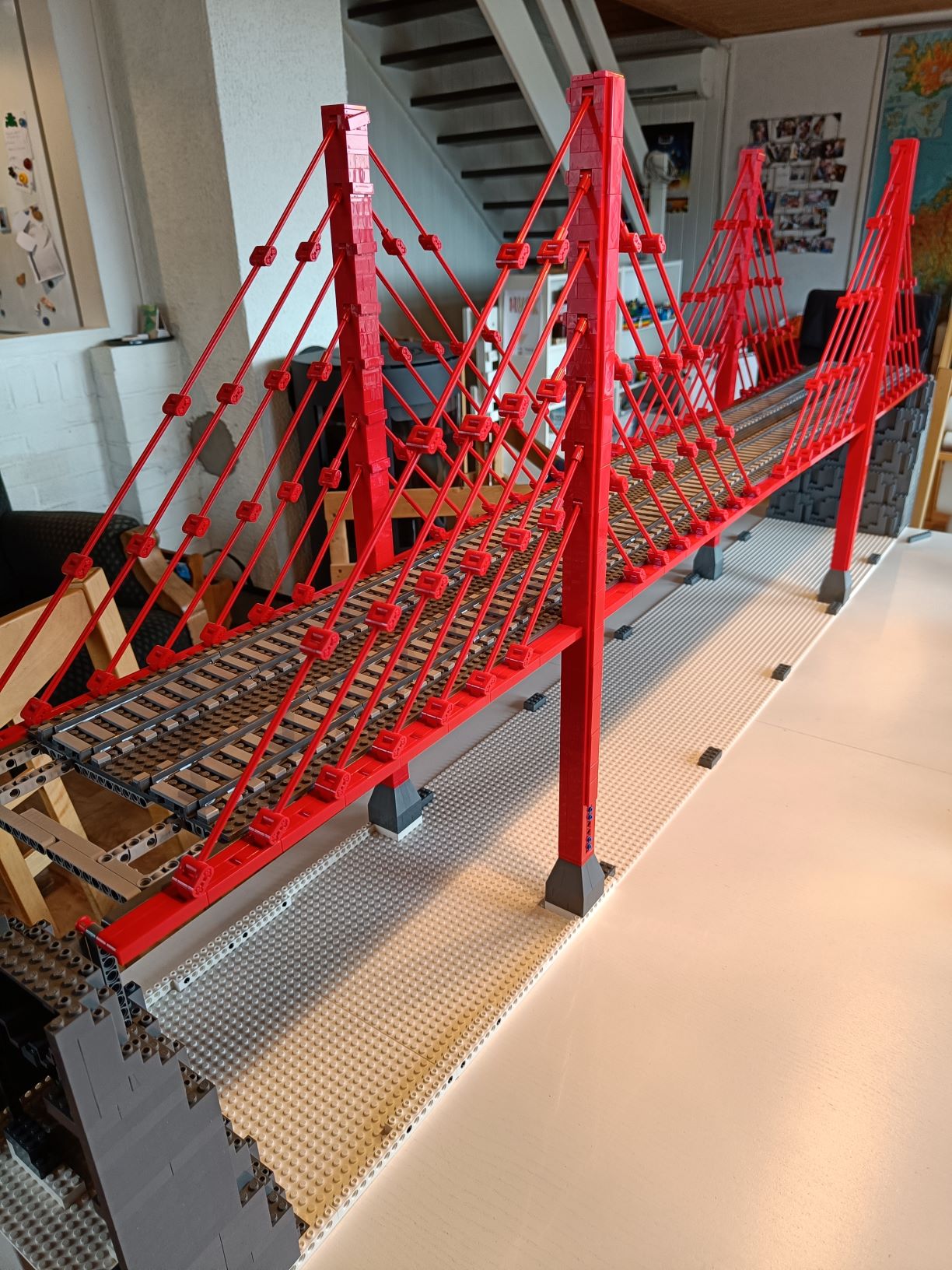 Jeg har lyst å ta med en togbro med dobbeltspor. Hvis det lar seg gjøre kan den gjerne være del av et felleslayout. Den er bygget for å stå på et bord som er lavere en “standardbordene” rundt omkring. Den lave seksjonen er 7 baseplater (32x32 studs) lang, 179 cm, og bordet 29 cm lavere en standard. Broen bruker også en 32x32 studs baseplate på hver side i den høye seksjonen for å konvertere til en smalere avstand mellom sporene. Broen ska klare tog med 10 studs bredde. Det er i stort sett bare en bro, med minimalt av miljø.